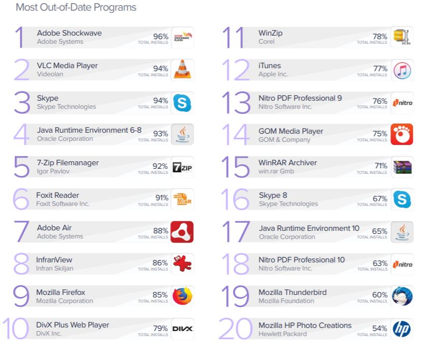 Spitzenreiter ist dabei Adobe Shockwave, das auf 96 Prozent der PCs in einer alten Version installiert ist. Auf Platz 2 folgt der beliebte VLC Media Player, Platz 3 belegt Skype. Dass gerade bei diesen Programmen Sicherheitsupdates oft nicht oder erst nach längerer Zeit installiert werden, liegt auch daran, dass bei diesen Programmen häufig nicht ersichtlich ist, dass ein Update bereitsteht. Allerdings halten viele Nutzer auch aus Gewohnheit an einer alten Software-Version fest, etwa, weil der neuen Version wichtige Funktionalitäten fehlen.